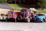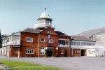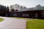 General views from the Paddock at Brooklands looking at (L->R) the Edwardian Clubhouse, the large building housing the stratospheric chamber, with the Shell Petrol Pagoda in front, the Bellman hangar, and vehicles parked beside the replica of the Avro shed.