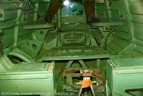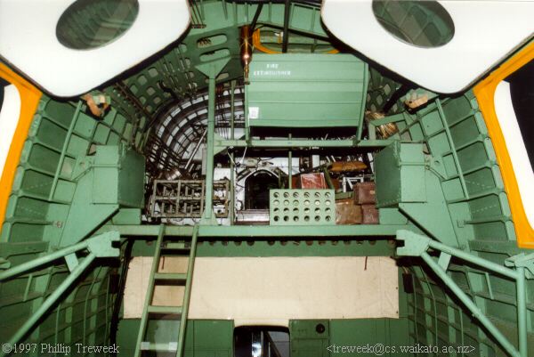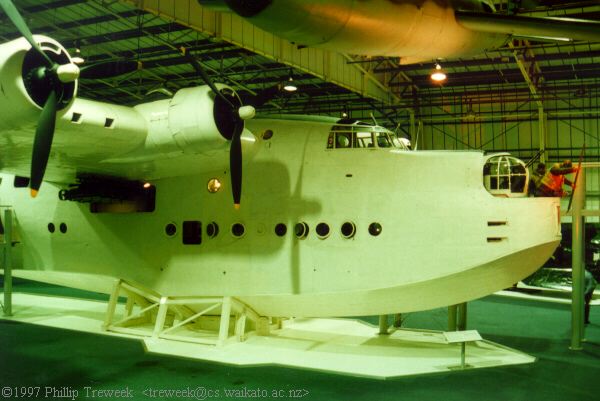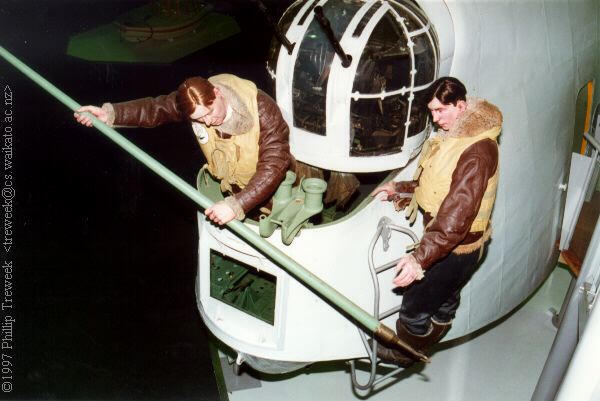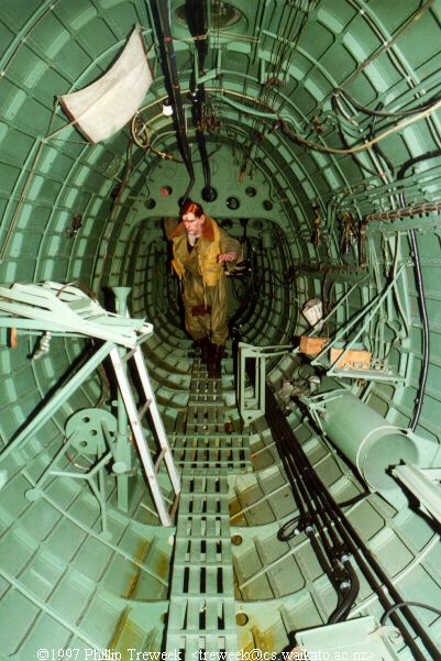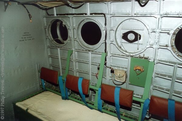 The aircraft is approached along a walkway past the figures 'engaged in mooring. The aircraft is entered from a hatch on the port side of the nose. From here it is possible to look forward into the nose (as shown) and up through a plexiglass screen into the upper deck (not shown). From here it is possible to move through the middle of the aircraft. Sensors trigger a recorded explanation of the various parts of the aircraft.