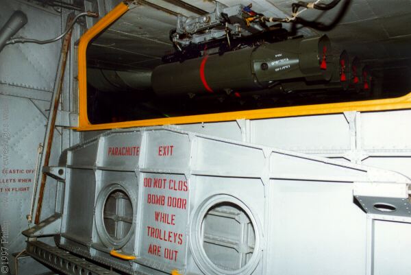 Further along, beneath the huge wings is the weapon's bay. The aircraft is shown with depth charges run out on trolley's beneath the aircraft's wings. This was only done when preparing to attack, because of the toll on aircraft performance caused by the huge drag of the extended weapons trolley. I was intrigued by the stenciling on the inside of the weapon bay doors - but I guess in the cold over the Atlantic some aircrew might have been tempted.