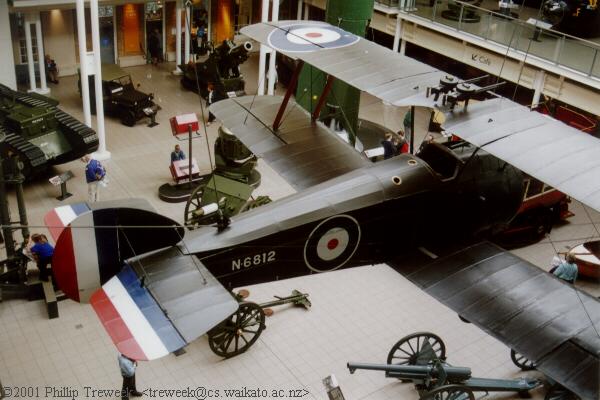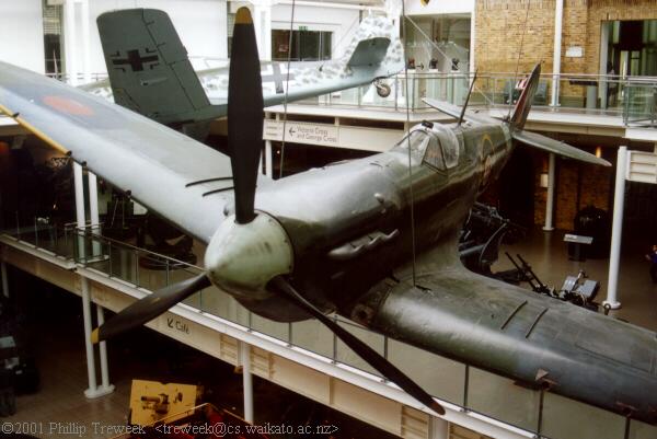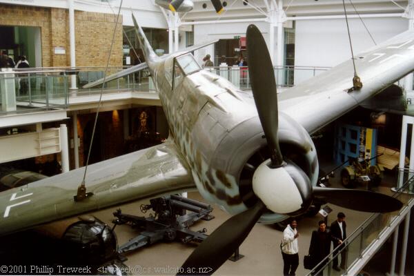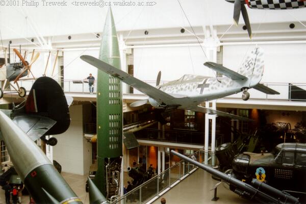 The Museum is housed in the former Bethlem Royal Hospital in Lambeth Rd. The building has a classical facade, and is easily identified by the 15" Naval Guns mounted outside. (One is from HMS Ramillies, the otheris from HMS Resolution). We got our tickets and walked into the Atrium or large exhibits gallery. Wow! My eyes were drawn to the FW190, P-51D, and Spitfire Ia which hang from the roof, along with an He-162 'Salamander', a BE-2c, and a Sopwith 2F1 Camel. For me it was just fantastic!